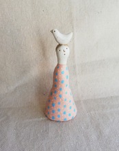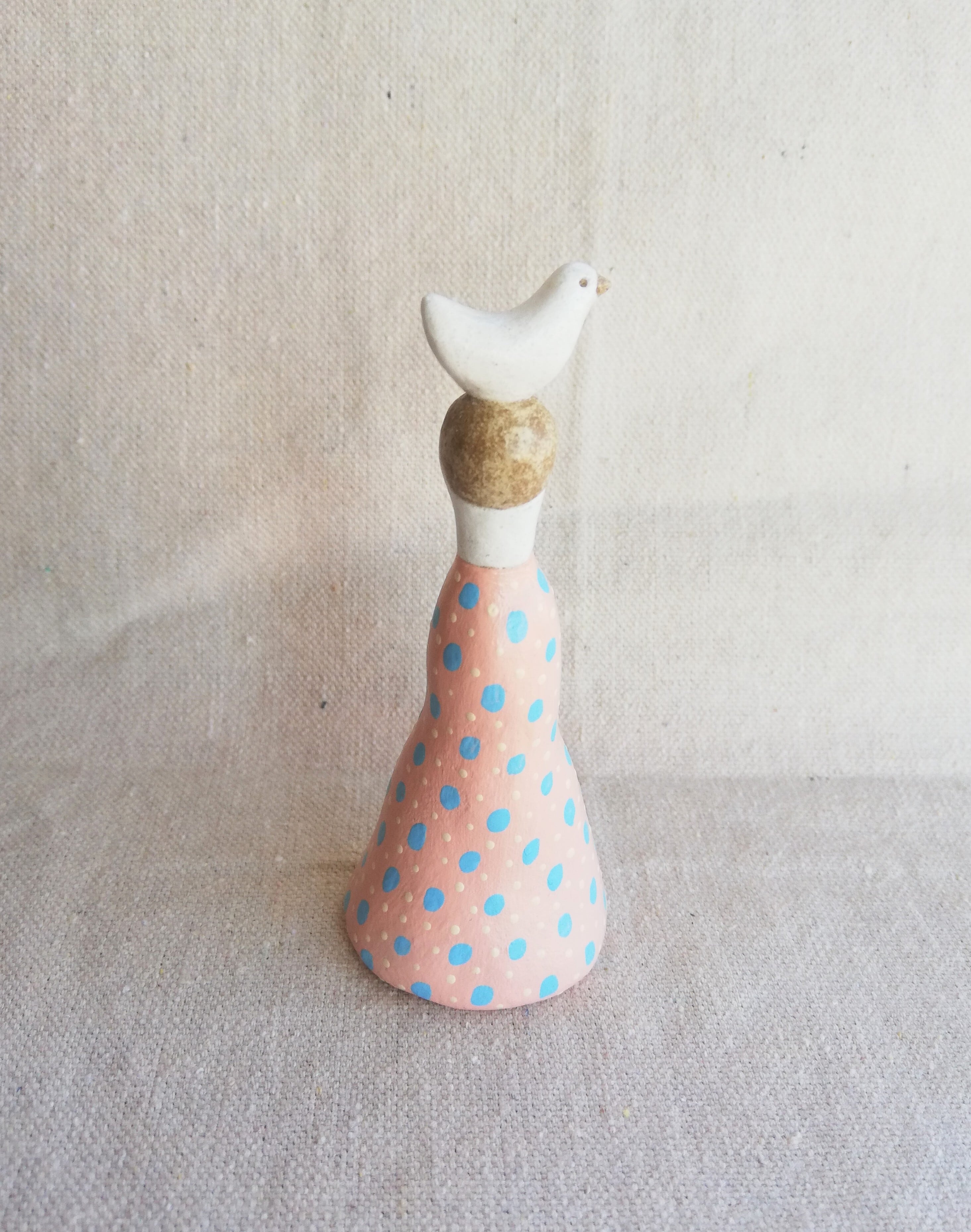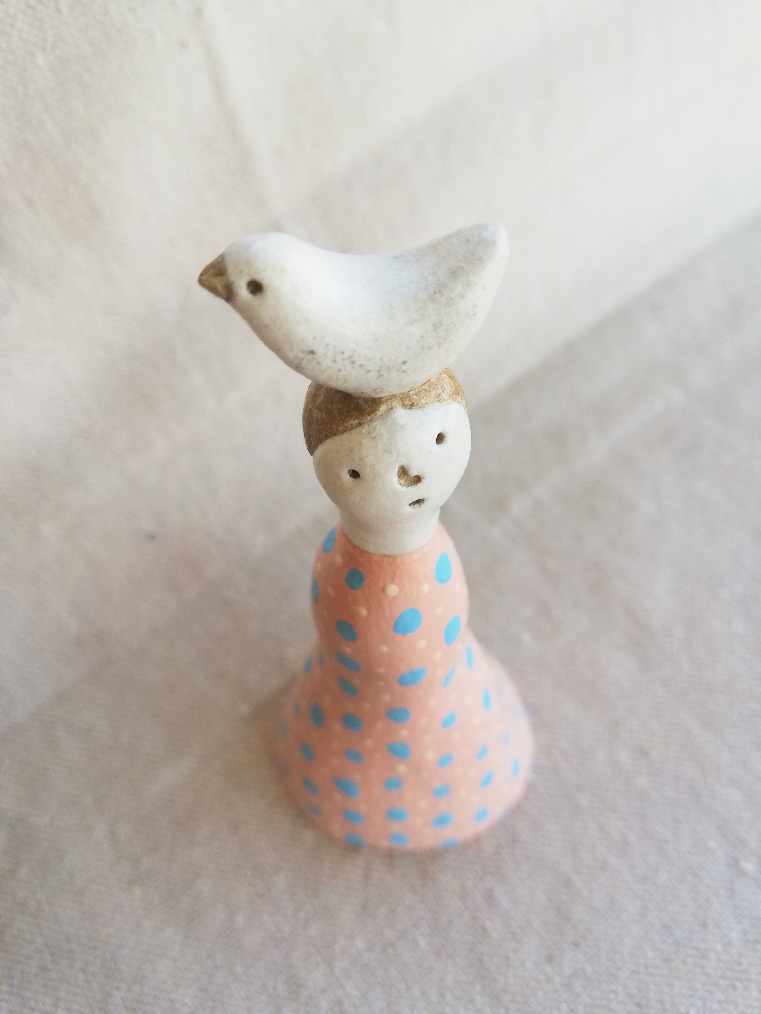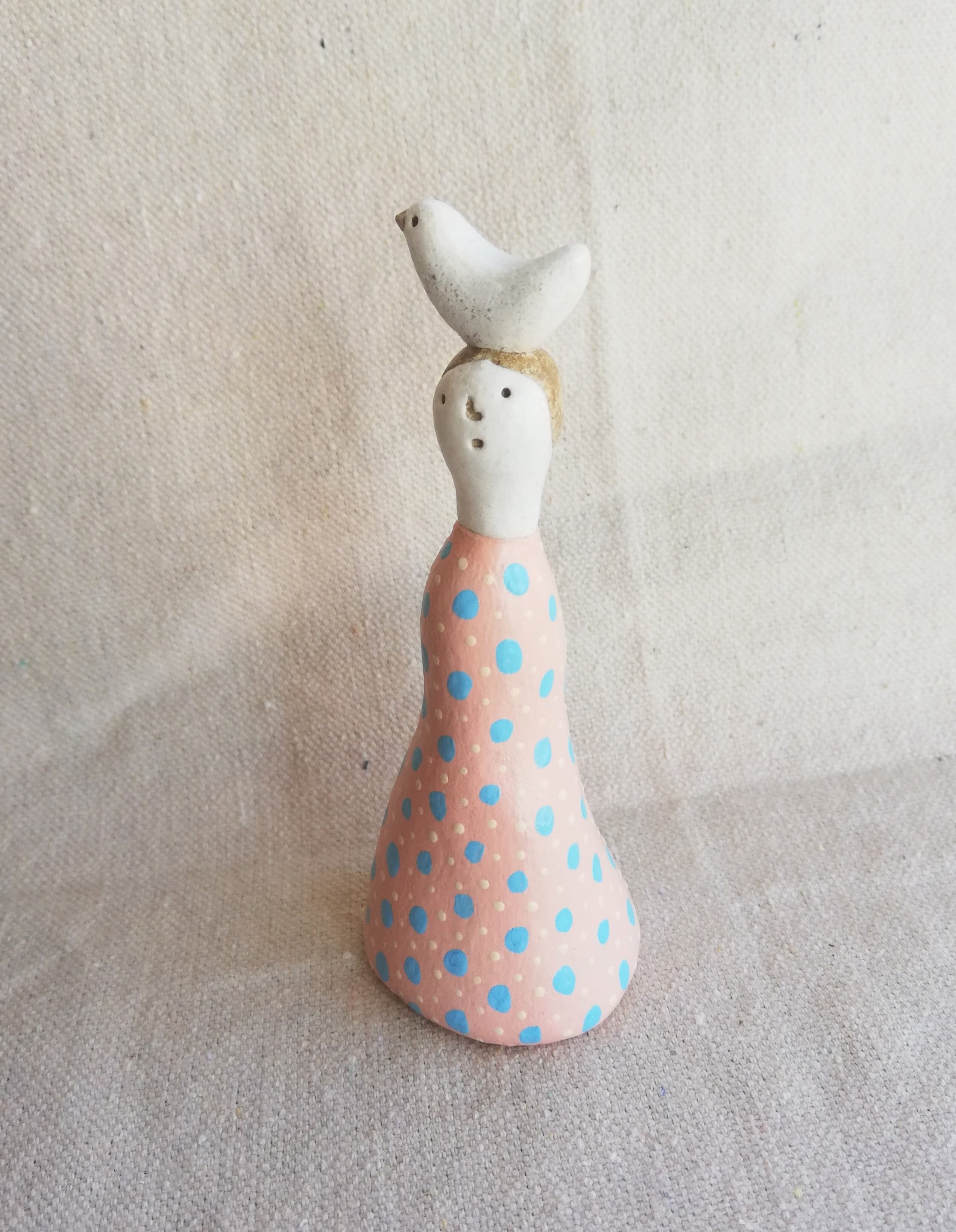 少し傾げた首と、曲線のあるフォルム、淡いピンクにドット柄のワンピース。